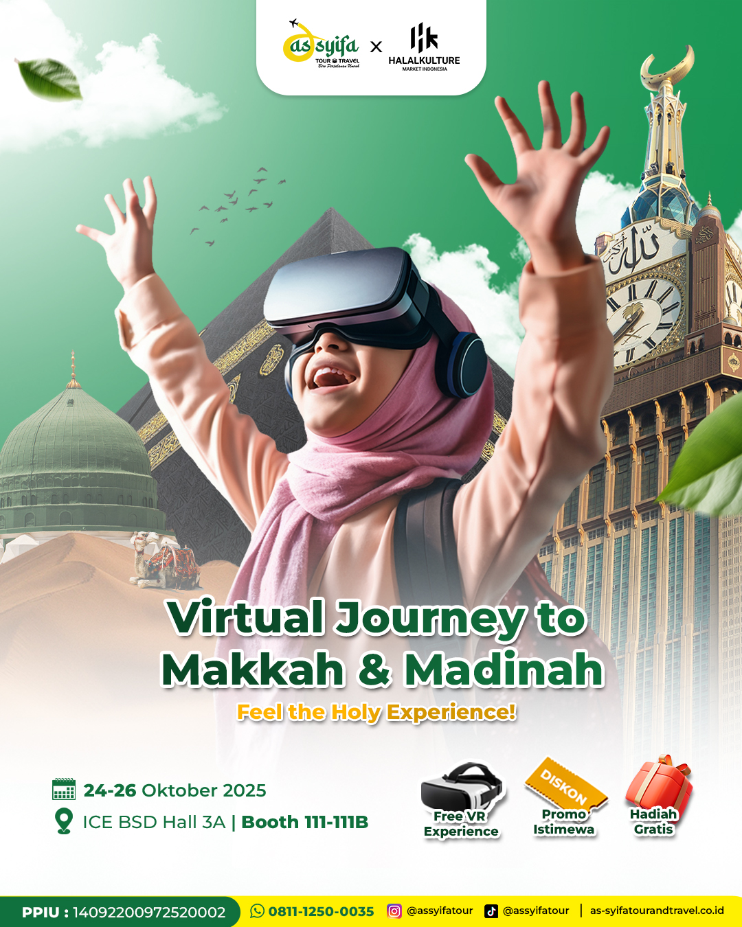 Hi Assyifel ✨ Rasakan pengalaman spiritual yang luar biasa! ✨ Yuk, kunjungi Virtual Journey to Makkah & Madinah bersama As-Syifa Tour & Travel di Halalkulture Market Indonesia 💚 🕋 24–26