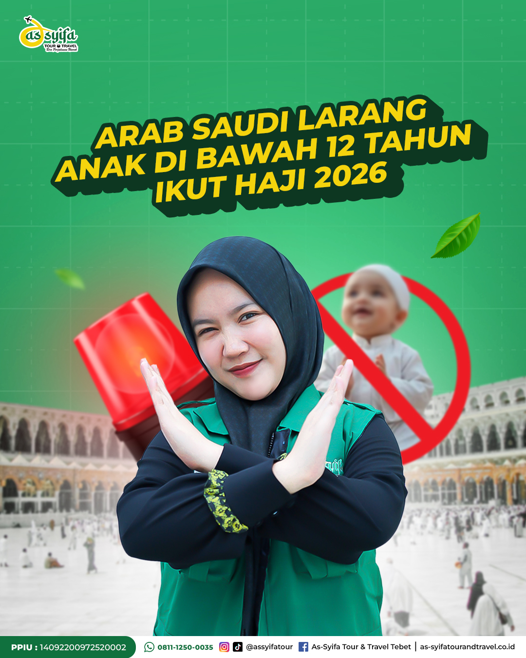 INFO RESMI HAJI 2026 Hi Assyifel Arab Saudi menetapkan aturan baru: anak usia di bawah 12 tahun tidak diperkenankan mengikuti ibadah Haji 2026. Aturan ini diumumkan melalui platform resmi pendaftaran